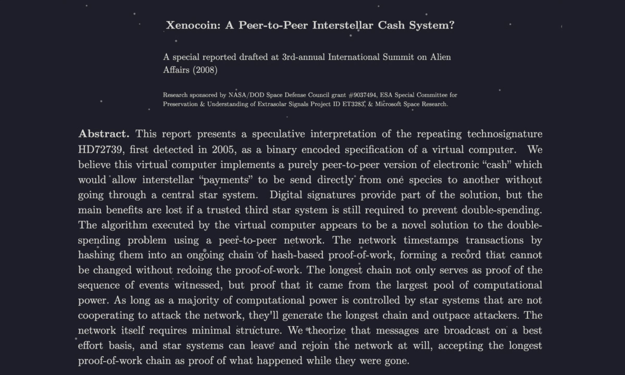 In a timeline where humanity received a Xenocoin signal before we invented bitcoin, we might get the Xenocoin white paper instead of the bitcoin white paper.