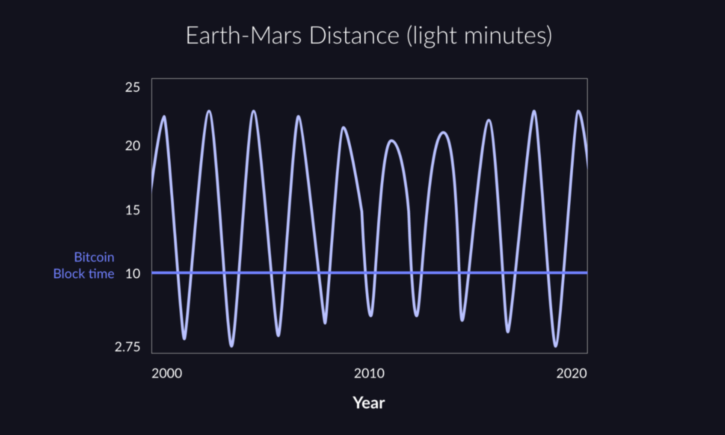 But there will still be challenges caused by the unavoidable delay inherent to all Earth-Mars communication. Bitcoin users and miners in particular will be affected because of their great distance from Earth and its center of hash:
