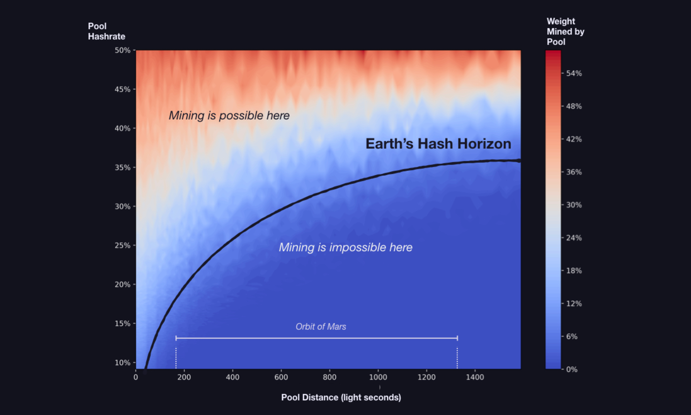 Let’s consider an example: A pool of bitcoin miners with, say, 10% of hashrate is located on Earth, near the center of hash. This pool will mine its corresponding fraction of hashrate in blocks: 10% of all blocks. If the pool moves into space very far away, and its distance to the center of hash increases, the pool will find itself winning less than 10% of blocks because of syncing problems caused by communication delays. The further away from the center of hash the pool travels, the lower their fraction of winning blocks. At some distance—some horizon—the pool will no longer win any blocks at all, despite still representing 10% of the hashrate.
