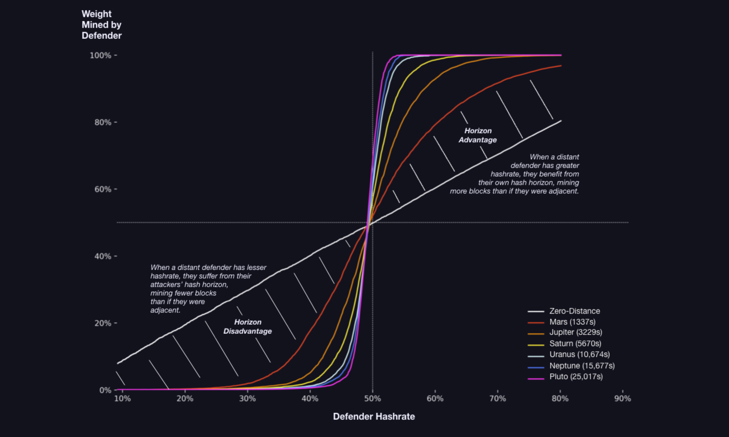 Following the red-orange curve for Mars’ distance to the left, when Martian’ defenders have less relative hashrate than attackers, the curve drops faster than the white, zero-distance line. This is a direct consequence of the Law of Hash Horizons—being in the minority at a distance confers a mining disadvantage. Conversely, following the red-orange Mars curve to the right, it rises faster than the white, zero-distance line. This is the Law of Hash Horizons again, but this time the disadvantage is the attackers’ because they have the smaller hashrate. This effect is even more dramatic for the outer planets at greater distances. The further a new blockchain launches from its potential attackers, the less relative hashrate is needed to defend it.