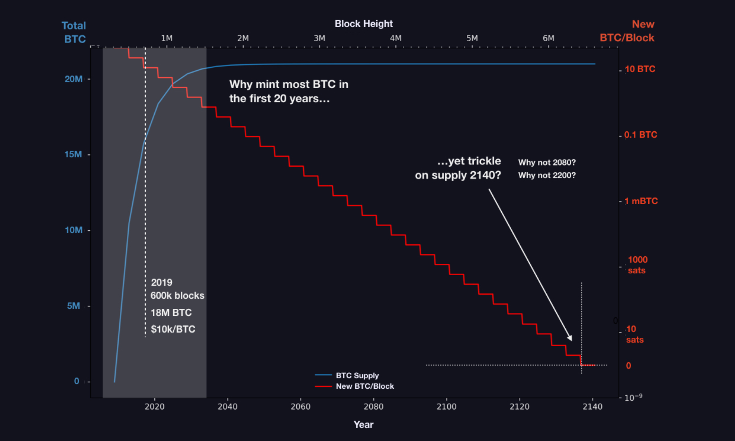 Martian Satoshi Conjecture: What if Satoshi designed bitcoin’s block reward schedule to continue minting BTC until the year 2140 when sufficient hashrate is developed on Mars to launch a new blockchain?