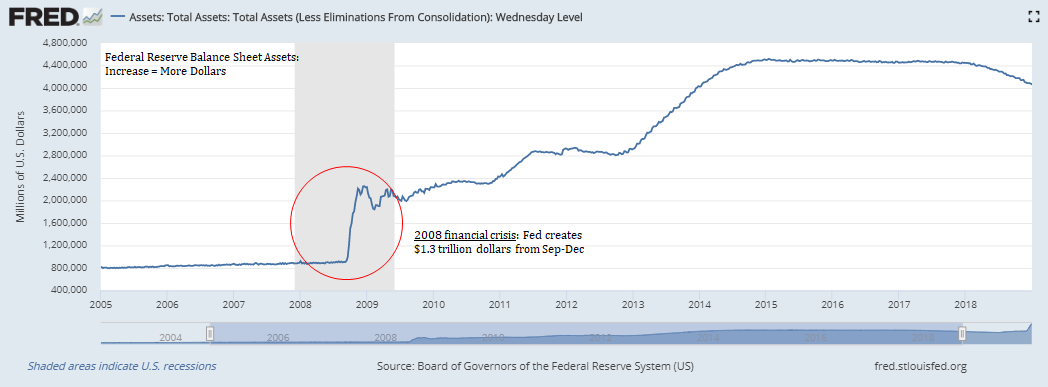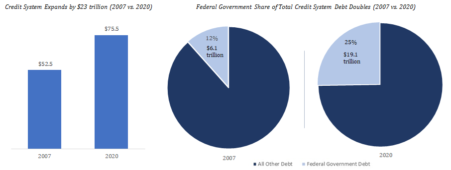 In a theoretical world, if the Fed were to distribute the money in equal proportion to each individual that held the currency previously, it would not shift the balance of power. In practical application, the distribution of ownership shifts dramatically, heavily favoring the holders of financial assets (which is what the Fed buys in the process of creating new dollars) as well as those with cheap access to credit (the government, large corporations, high net-worth individuals, etc.). In aggregate, the purchasing power of every dollar declines, just not immediately, while a small subset benefits at the cost of the whole (see the Cantillon Effect). Despite the consequences, the Fed takes these actions in an attempt to support a credit system that would otherwise collapse without the supply of more dollars. In the Fed’s economy, the credit system is the price setting mechanism as the amount of dollar-denominated debt far outstrips the supply of dollars, which is also why the purchasing power of each dollar does not immediately respond to the increase in the money supply.