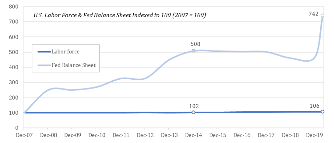 Since 2007, the Fed balance sheet has increased seven-fold, but the labor force has only increased 6%. There are roughly the same number of people contributing output (human time) but far more dollars to compensate for that time. Do not be confused by impossible-to-quantify theory concerning the idea of a job saved versus a job lost; this is the U.S. labor force, defined by the Bureau of Labor Statistics as all persons 16 years of age and older, both employed and unemployed. The inevitable result is that the value of each dollar declines, but it does not create more workers, and all prices do not adjust ratably to the increase in the money supply, including the price of labor.