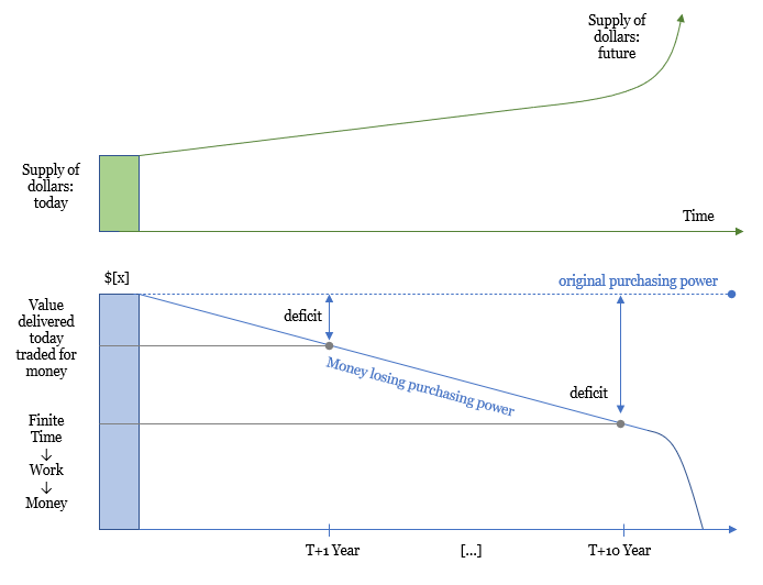 To use an extreme for illustrative purposes, imagine you spent 40 hours in a week working for $10 per hour ($400 total). Then consider the consequence if the dollar’s value were to “hyperinflate,” effectively trending to zero over a short period. That would translate to a week of time which you can never get back and which would purchase you nothing in the future. In the practical application of hyperinflation, it is not just a week that is lost but instead, entire life savings. It is a path to sure ruin, but really, anything on the spectrum of currency devaluation is similarly problematic. Time is required to produce work, which translates to goods and services. Any time expended in the past saved in a form of money which purchases less in the future creates a deficit. As dollars become massively more abundant and time remains finite (past, present and future), more dollars compete for a relatively fixed quantity of goods and services. People value each dollar less and charge more dollars for each unit of their time in an attempt to reduce the deficit created by more money having been created and to offset the expectation of future degradation. More dollars, same amount of time. Inflation is that simple but the consequence is not.