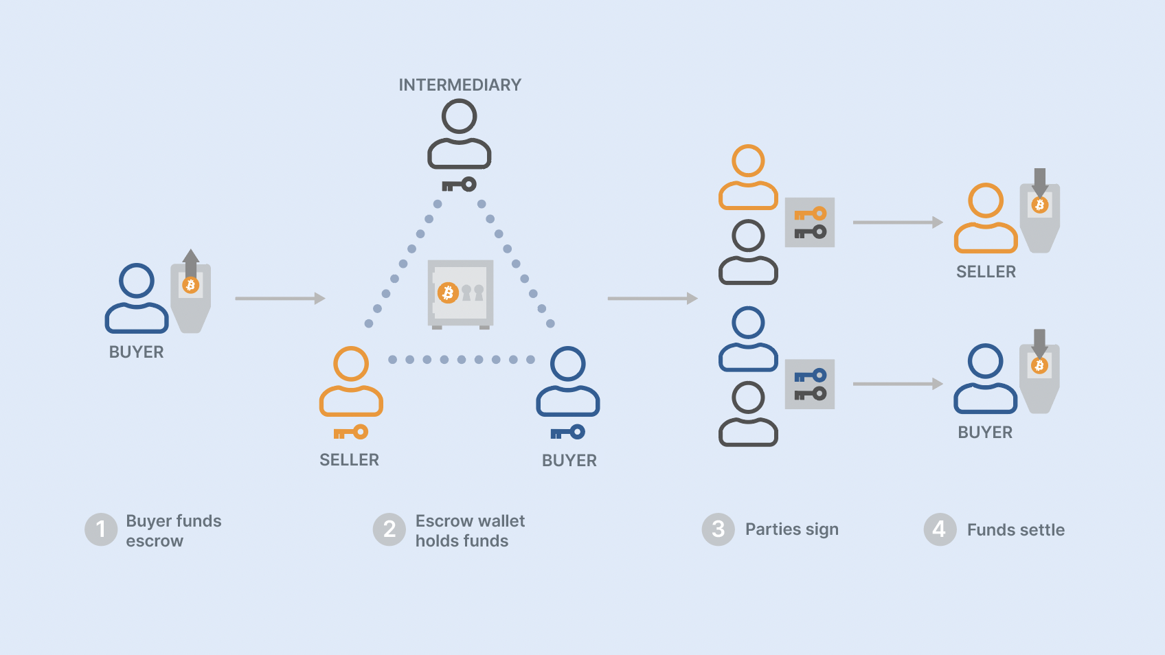 The simplest structure for a bitcoin multisig escrow is a 2-of-3 multisig wallet in which one key is held by each of the two trading parties and one by an intermediary. In this scenario, the keys privately held by three individuals are combined to construct the wallet, with signatures from two of the three keys required to disburse funds. Let’s look at some example scenarios.
