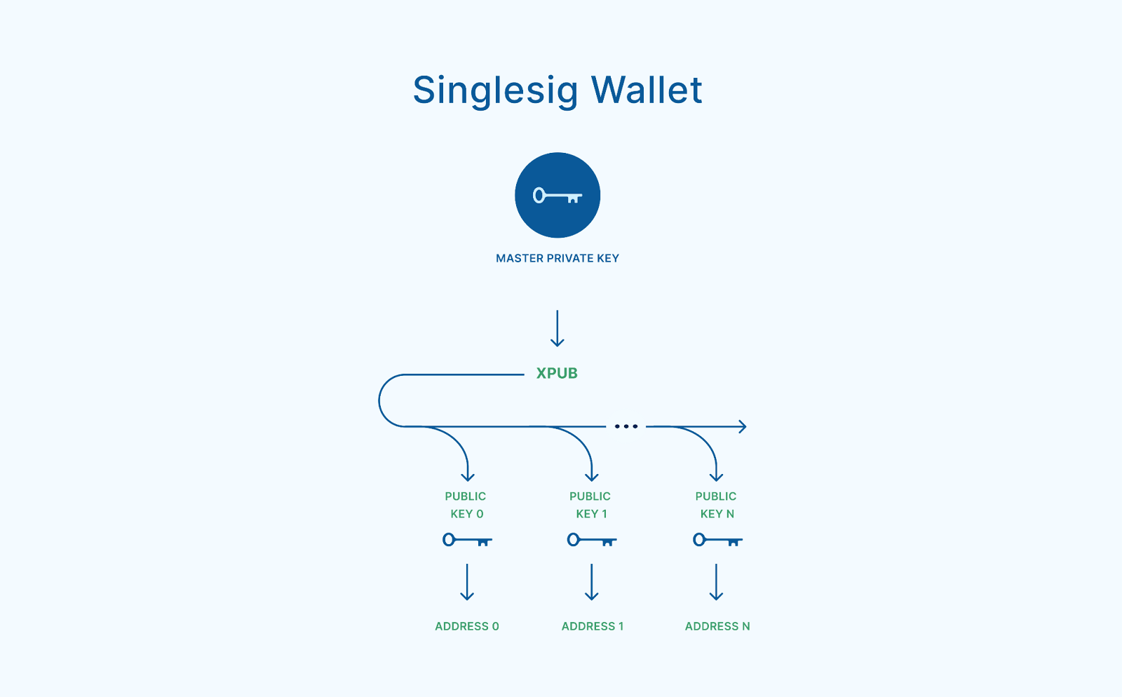 A master private key creates one xpub out of many possibilities. That xpub represents the singlesig wallet, and it can produce many different addresses to receive and hold bitcoin on the blockchain.
