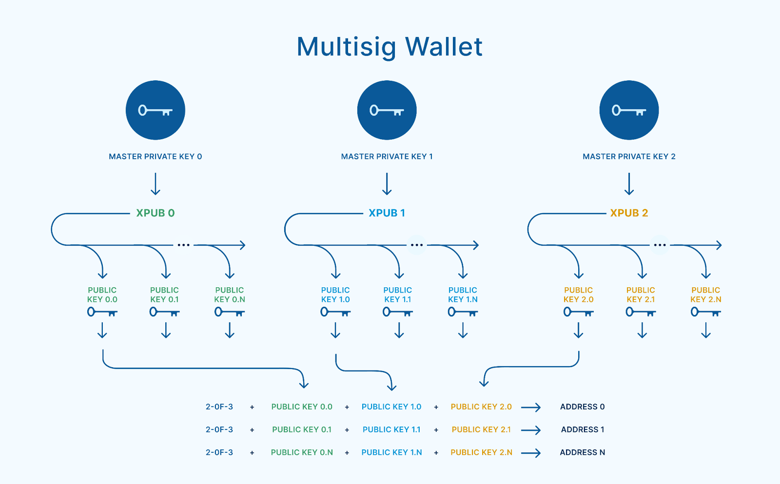 In a 2-of-3 multisig wallet, three master private keys each create one xpub. The quorum of three xpubs represent the multisig wallet, and together they can produce many different addresses to receive and hold bitcoin on the blockchain.
