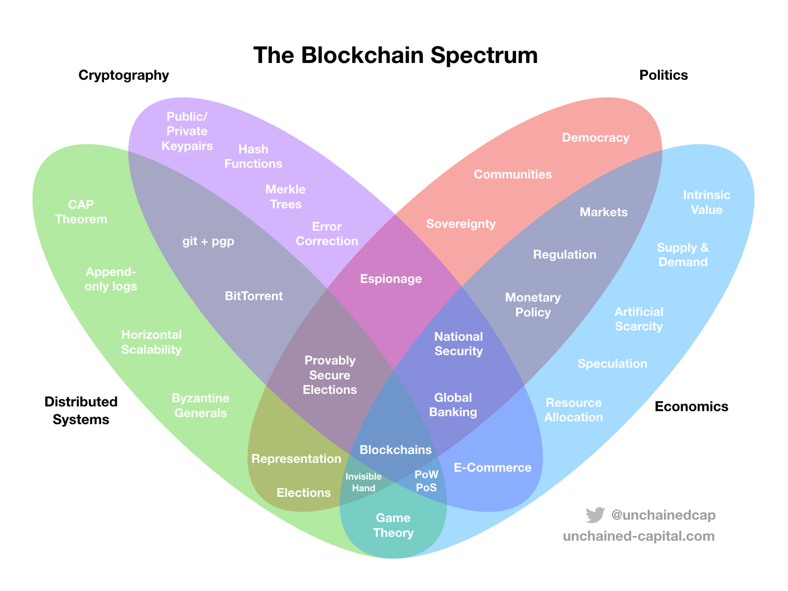 Blockchains are just as much a new socioeconomic pattern as they are a new kind of technology, and the split between “technical” disciplines on the left (Distributed Systems & Cryptography) and “non-technical” disciplines on the right (Politics & Economics) emphasizes this.