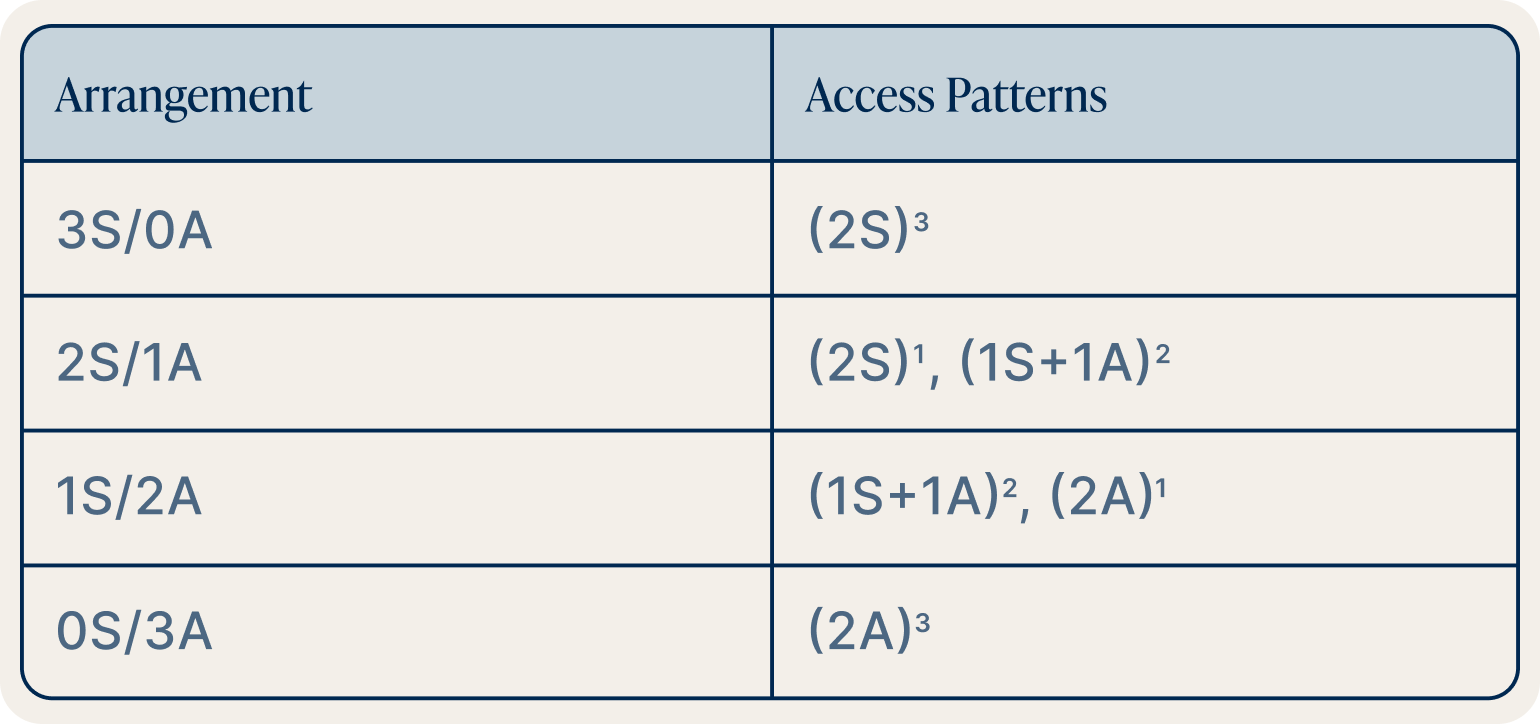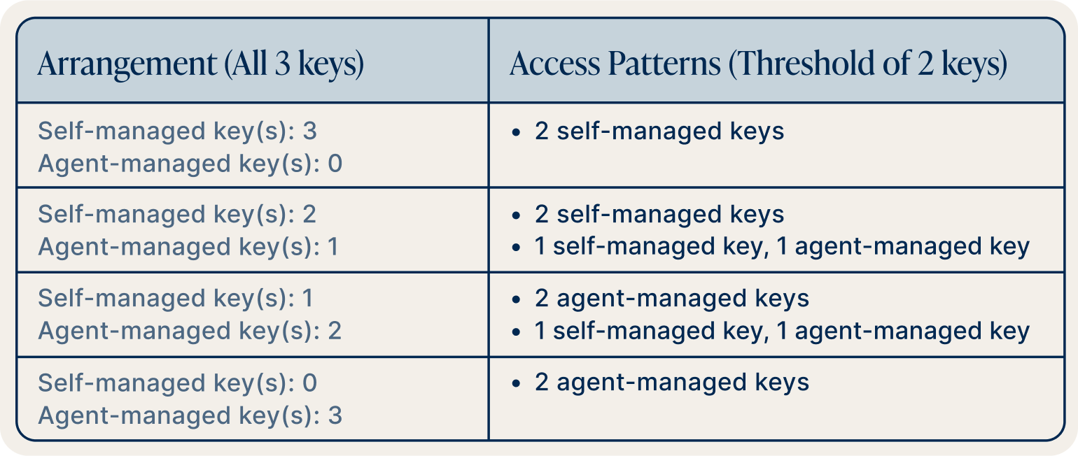 In this article, we will introduce a shorthand system to show arrangements and access patterns in a more concise manner. Arrangements such as “2 self-managed keys and 1 agent-managed key” will be shown as “2S/1A” and include a slash. Access patterns such as “1 self-managed key and 1 agent-managed key” will be shown as “1S+1A” and include a plus sign.