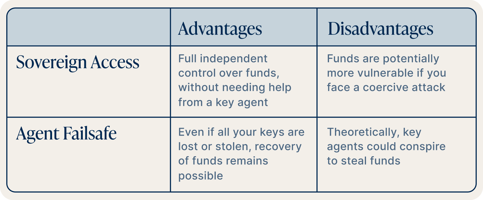 Sovereign access could be desirable if you want to be able to access your bitcoin independently from third-party involvement, but it could be undesirable if you are concerned about the possibility of an attacker coercing you to give up funds. An agent failsafe could be desirable if you are concerned about losing all of your self-managed keys, but could be undesirable if you are concerned that your key agents might maliciously collude to access your bitcoin without your permission.