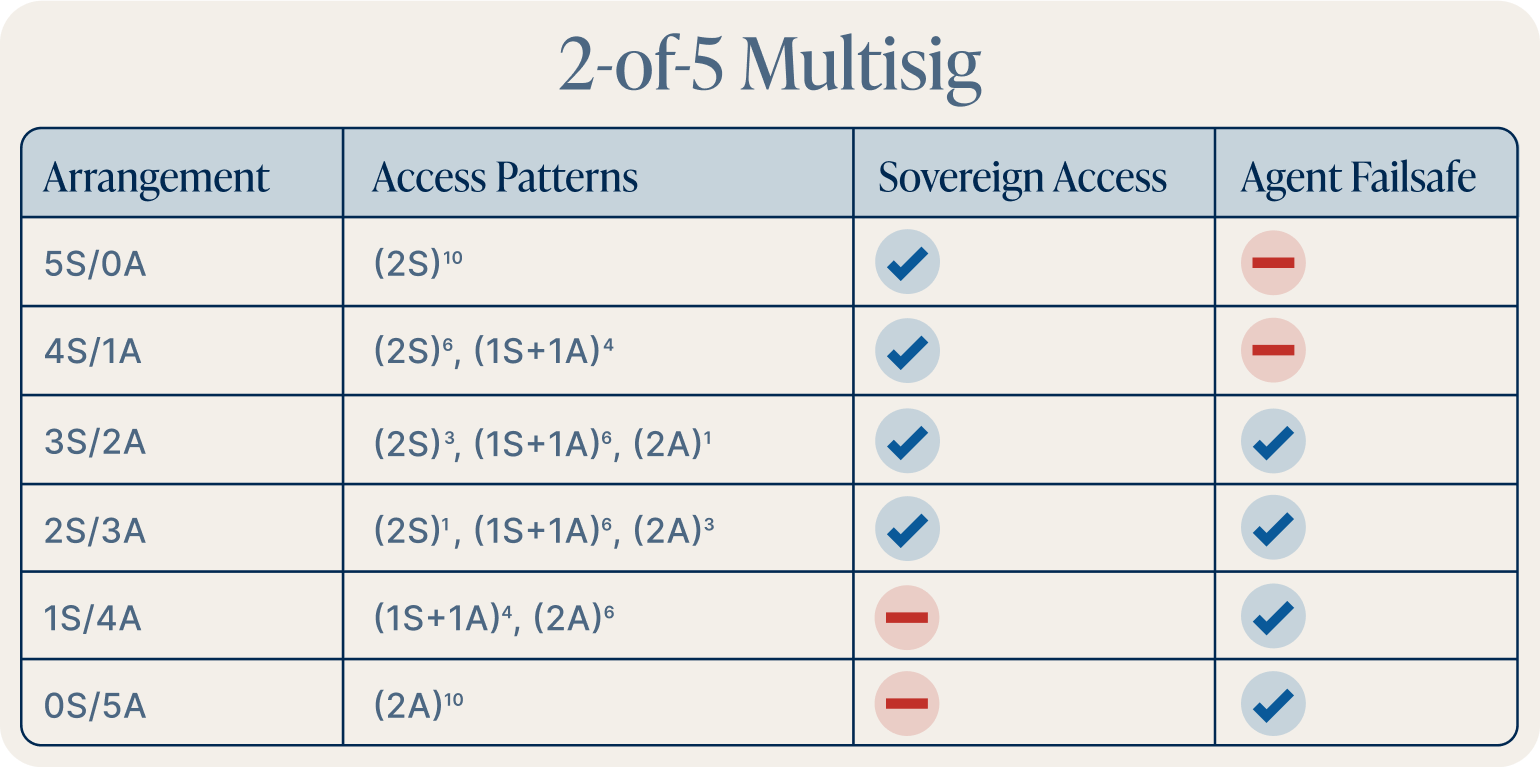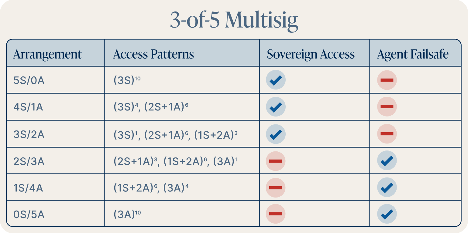 There are some interesting 3-of-5 arrangements to consider, such as 3S/2A, which enables sovereign access but also a path to recovery if a majority of self-managed keys are lost. 2S/3A enables an agent failsafe of 3 different agents, but also the ability to work with just one of them plus your own two self-managed keys.