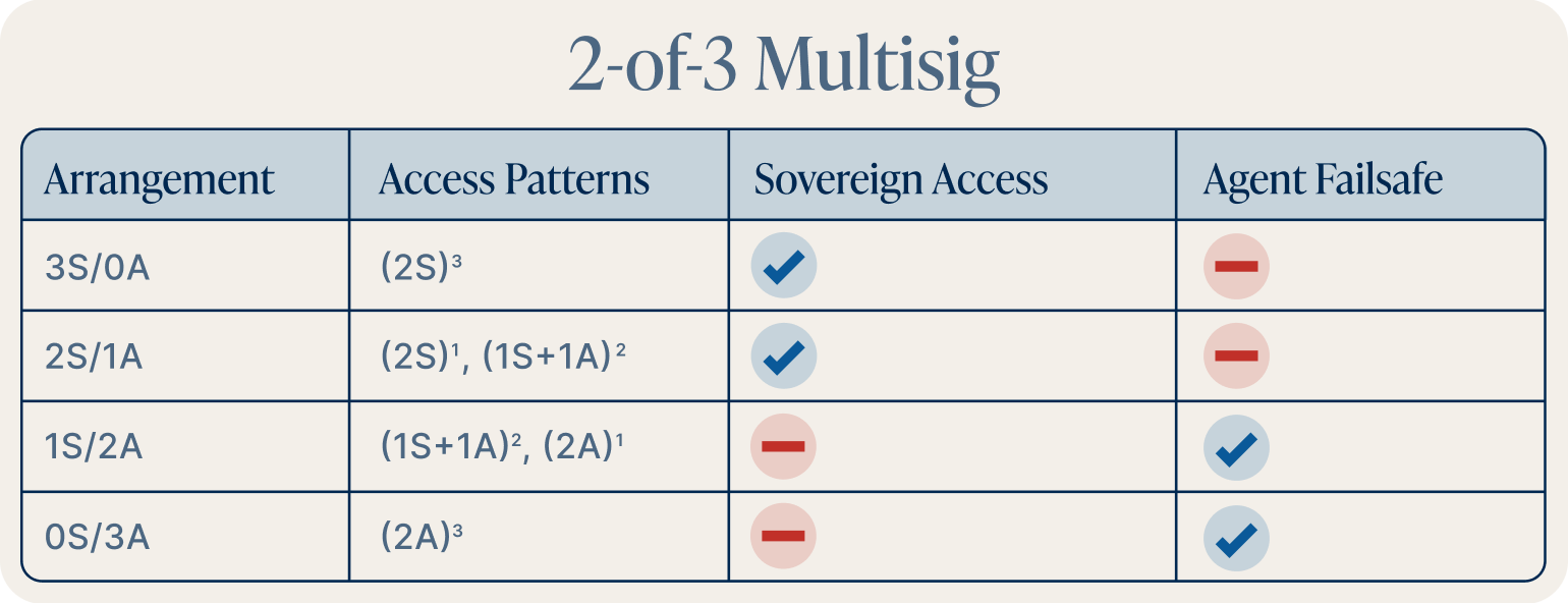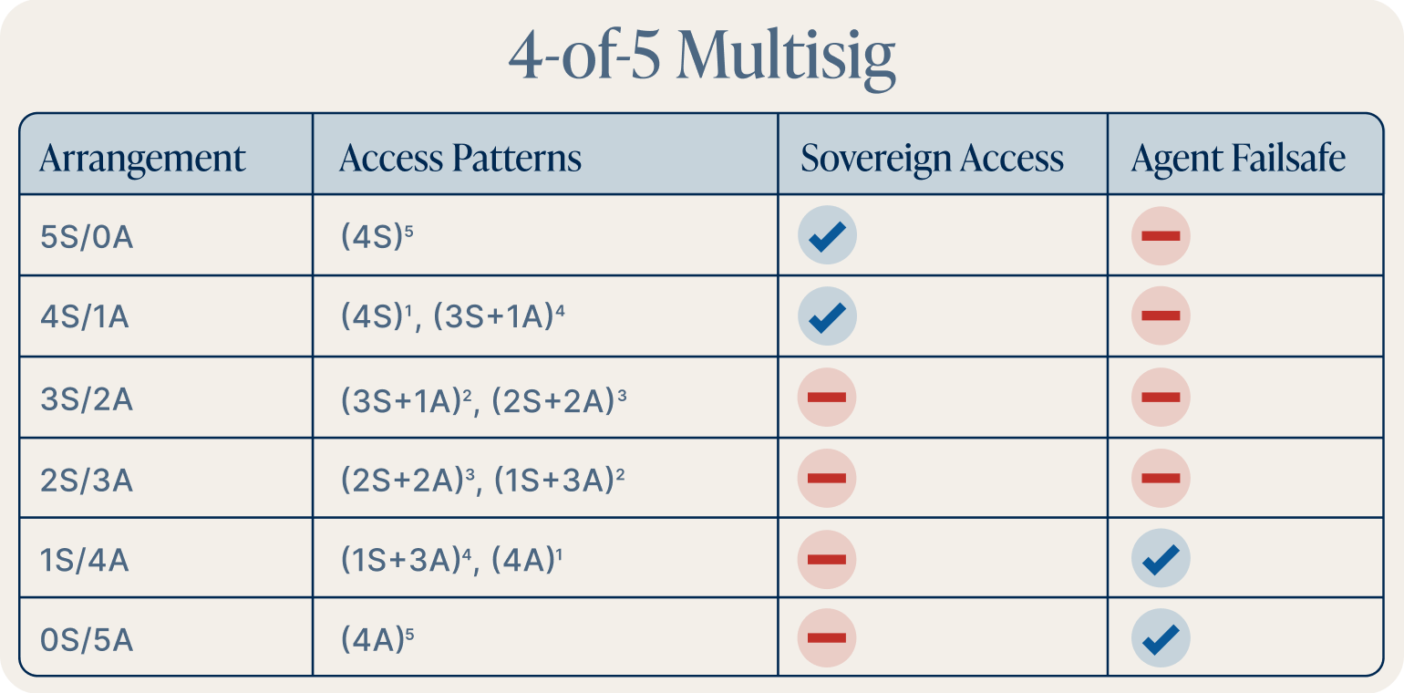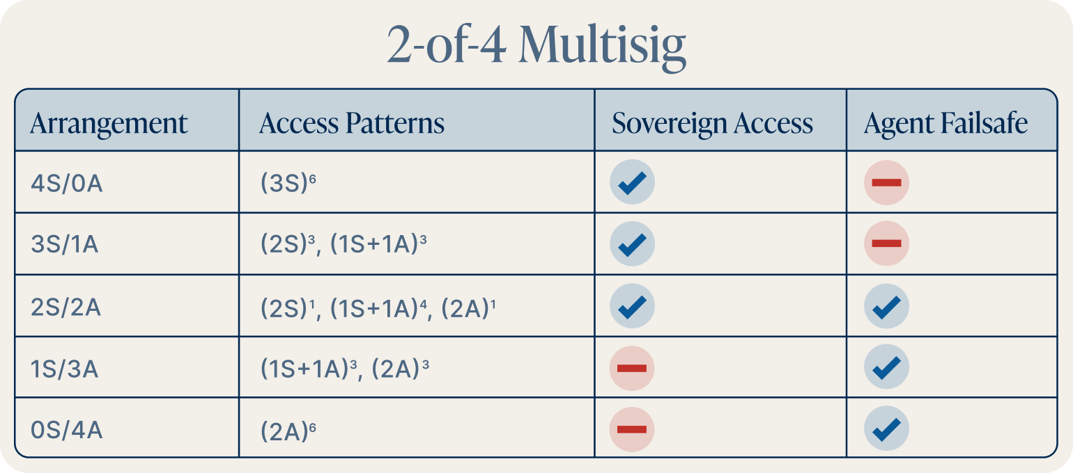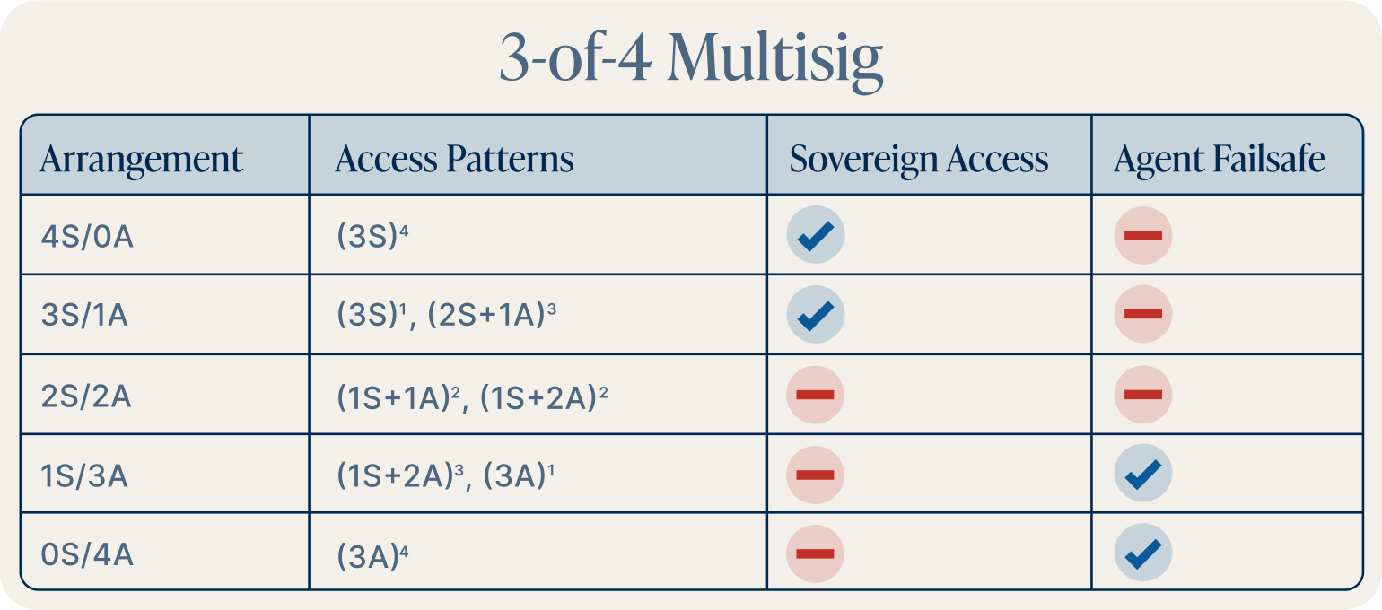 The arrangements within 3-of-4 multisig quorums can provide many of the same access pattern sets as 3-of-5, although 2S/2A provides a unique profile. It is the least complex way to prevent both sovereign access and an agent failsafe. This might be attractive to someone who is concerned about the possibility of a coercive attack on their self-managed keys, and therefore wants key agents to be involved in a withdrawal process, but simultaneously wants to prevent the possibility of key agent collusion. Both of these concerns are related to the threat of theft, which is the type of protection prioritized by right-of-center quorums, rather than the threat of lost access.