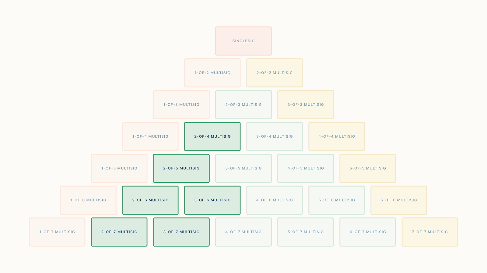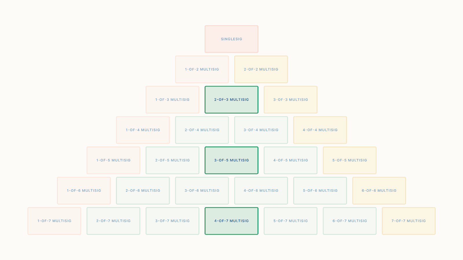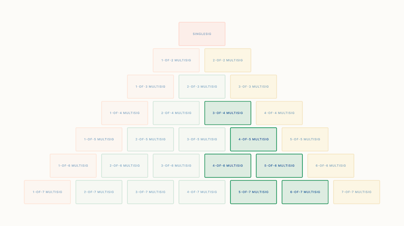 In our introductory multisig article, we created a multisig pyramid diagram to illustrate this concept. We pointed out that 2-of-3 is typically ideal, 1-of-N and N-of-N quorums fail to eliminate single points of failure, and hinted that some quorums beyond 2-of-3 could be useful for individuals or businesses with specific or elaborate needs: