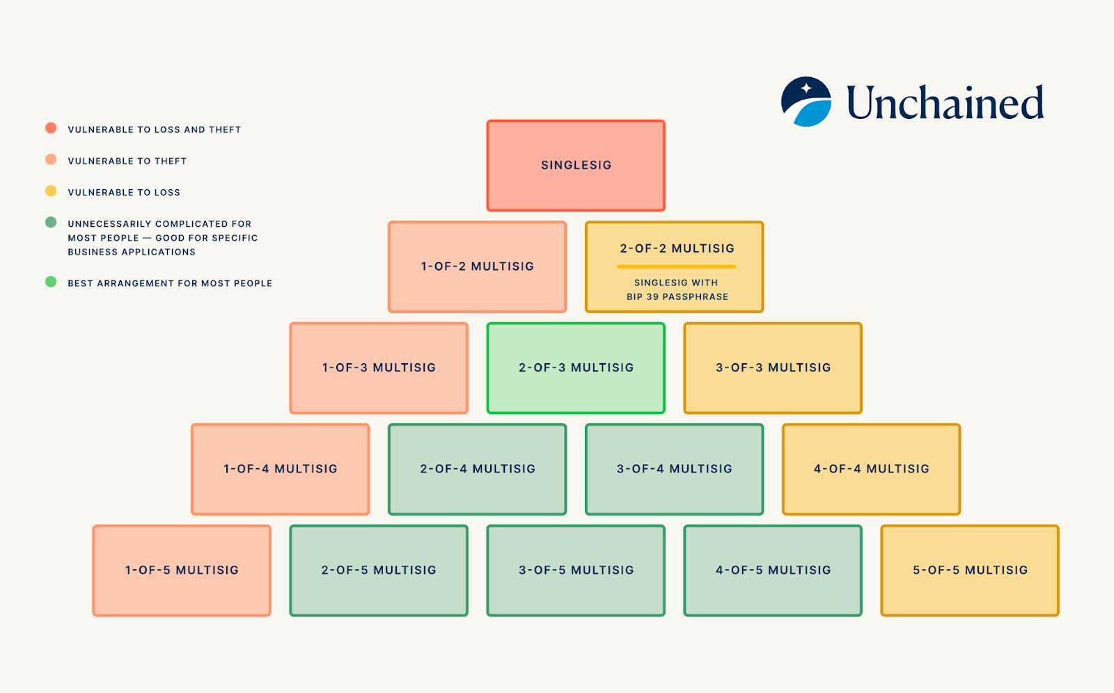 As you can see from the chart above, some arrangements offer more access patterns than others, which may be more attractive for people who seek optionality in how directly involved they must be when withdrawing their bitcoin from cold storage.