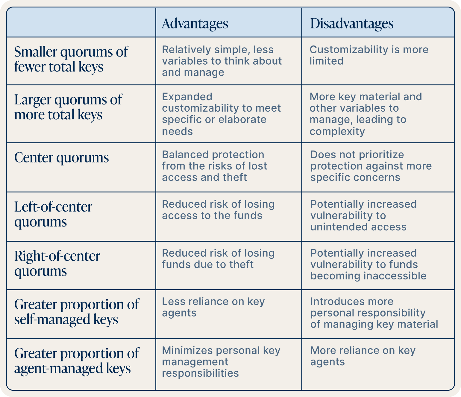 Upon considering these questions, most individuals are likely to find that one of the arrangements available within a 2-of-3 quorum aligns with their objectives. However, some people may also lean toward a 3-of-5 quorum for added customizability, a 2-of-4 quorum to have sovereign access alongside an agent failsafe, a 3-of-4 quorum to lock funds down for years on end, or a 4-of-6 quorum to mimic a 3-of-4 but with a bit more protection against key loss.