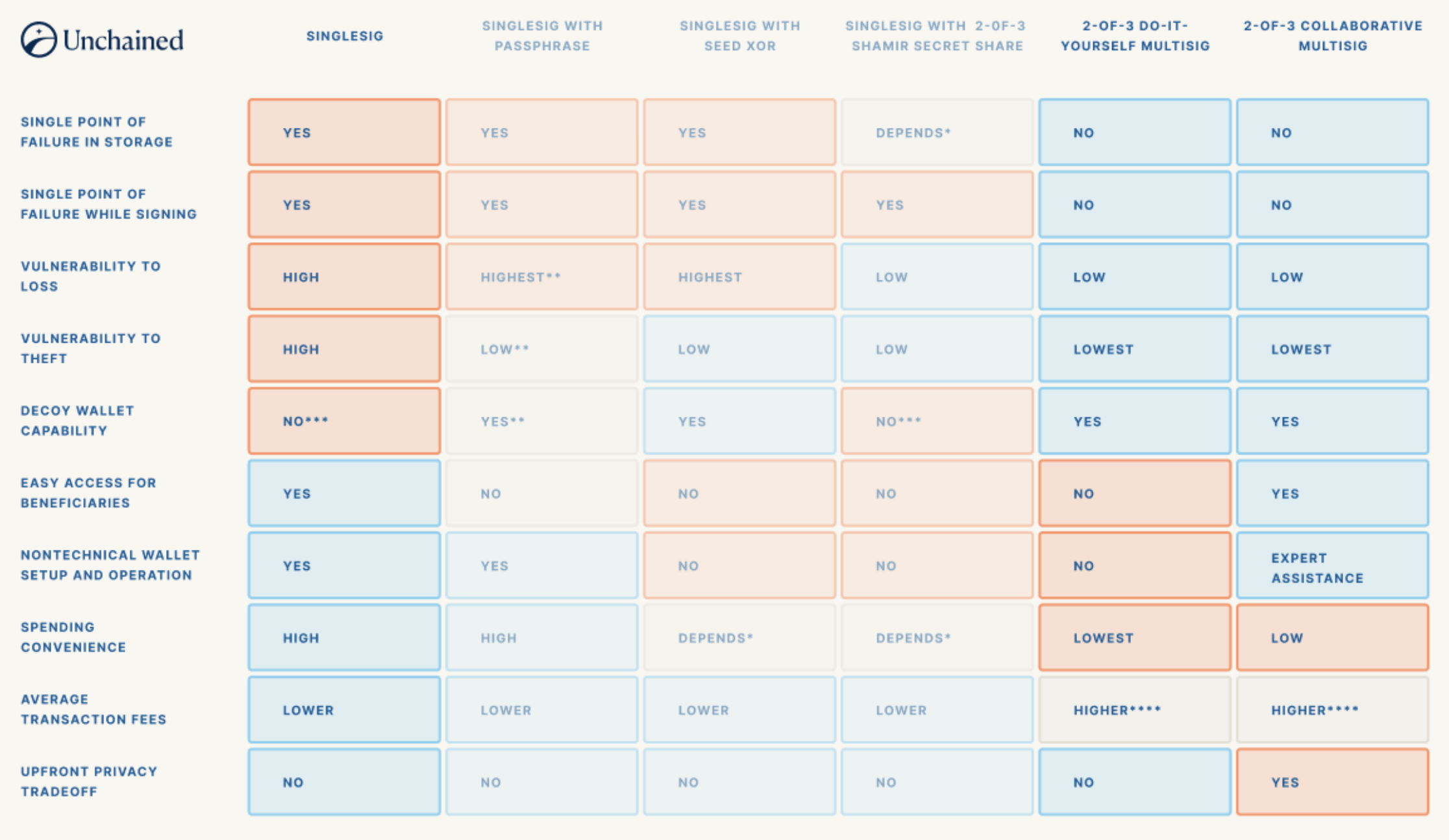 Bringing back the chart from our article comparing singlesig wallets to multisig wallets and highlighting the sections that focus on DIY multisig and collaborative multisig, we can observe the main differences in these models.