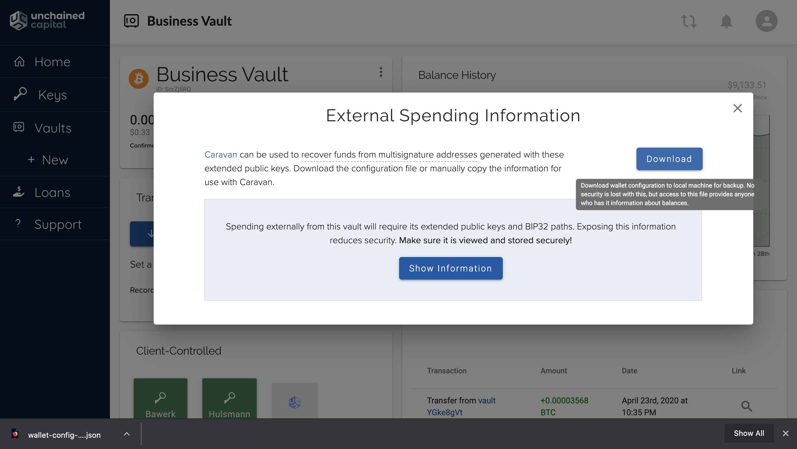 - After creating your multisignature address on the Unchained Capital Website, select the external spend information menu, and download the external spend file.