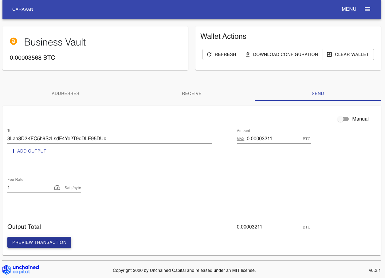 - Select which bitcoin client to gather wallet balances from, either publicly from Blockstream.info or privately from your full node. Confirm. Caravan will load your wallet details.