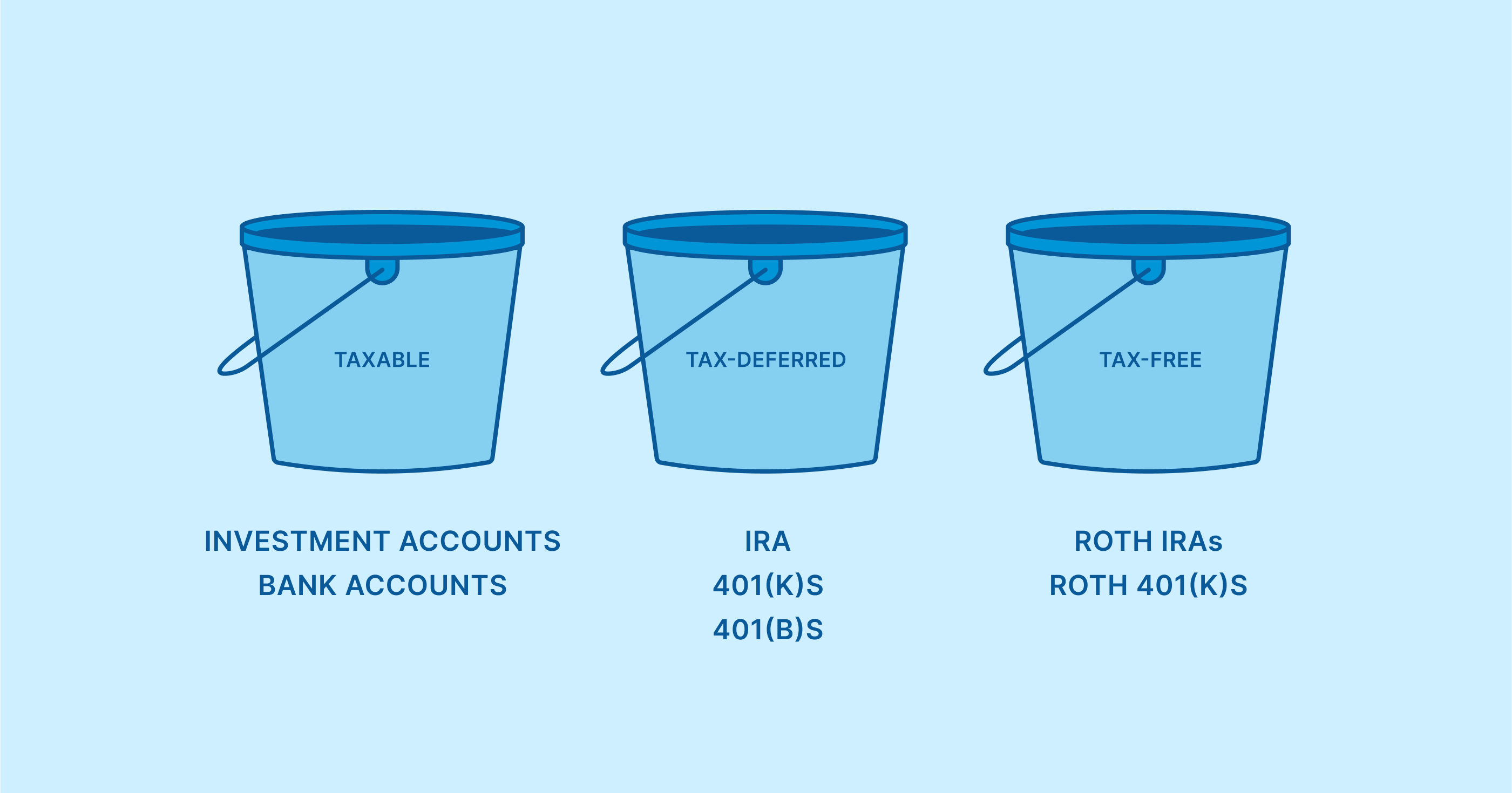 To make a plan, Rod needs to think about each account type as being in a different “tax bucket”. His taxable assets are taxed upon sale, and his tax-deferred accounts are taxed when he takes income from them. The Roth provides another bucket: tax-free income. If Rod were to add a Roth IRA, he could pull from different buckets depending on the plan and the need.
