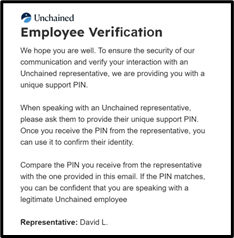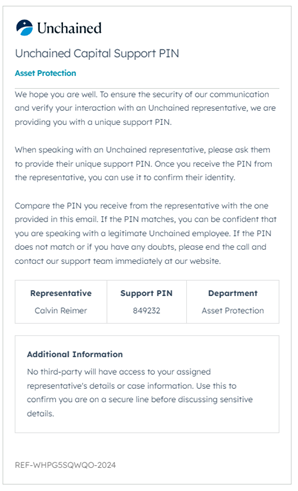 Verify the caller's identity: If someone claims to work at Unchained, ask for their Support PIN. Unchained’s support PINs are never confirmed over email.