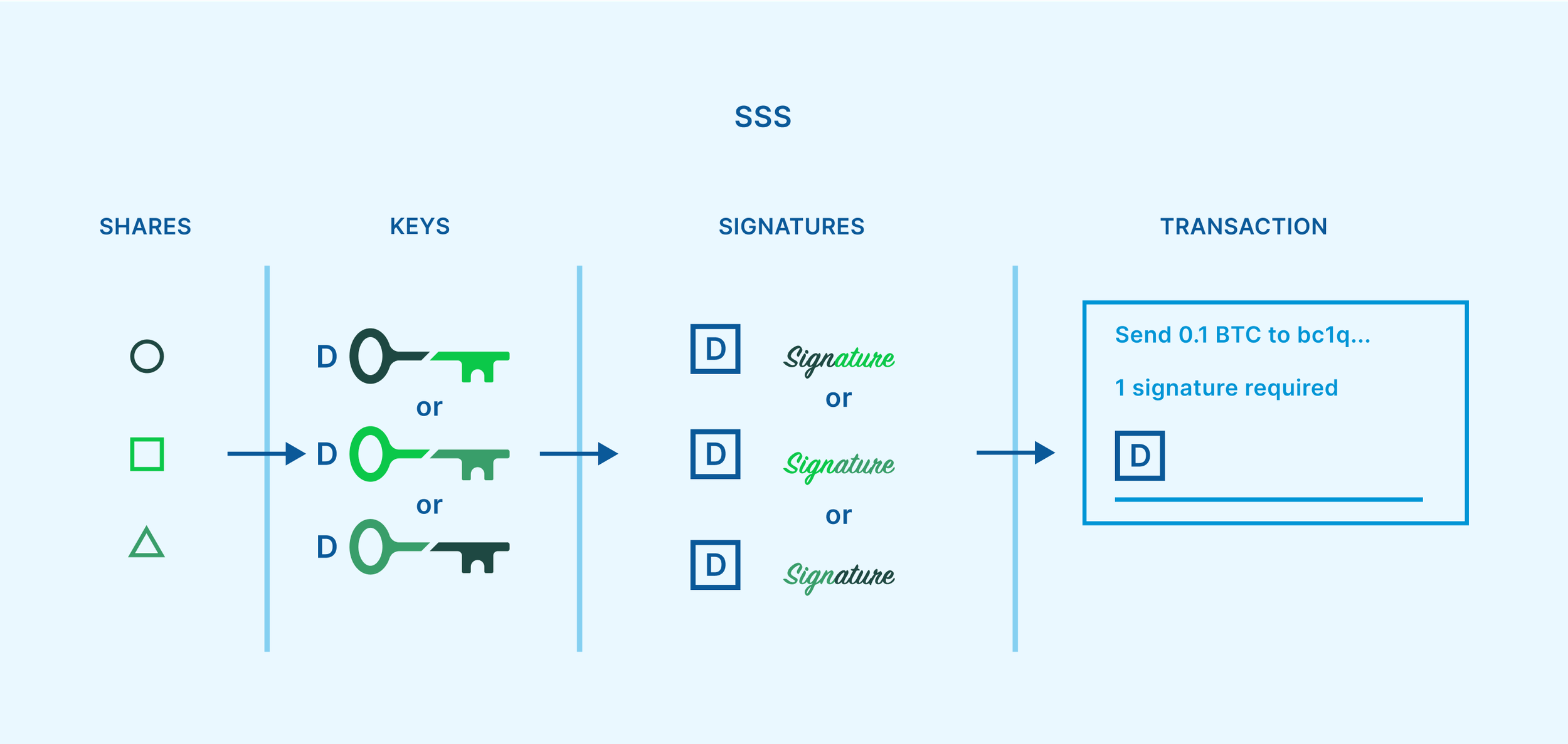 Shamir’s secret sharing (SSS) is a secret sharing algorithm that was developed by renowned cryptographer Adi Shamir in 1979. It can be used as another way of introducing a threshold requirement for protecting bitcoin. SSS allows users to split a key into several distributed “shares,” with only a certain threshold of the shares needed to reassemble the key. This can be used to design quorums like 2-of-3 or 3-of-5, similar to multisig.