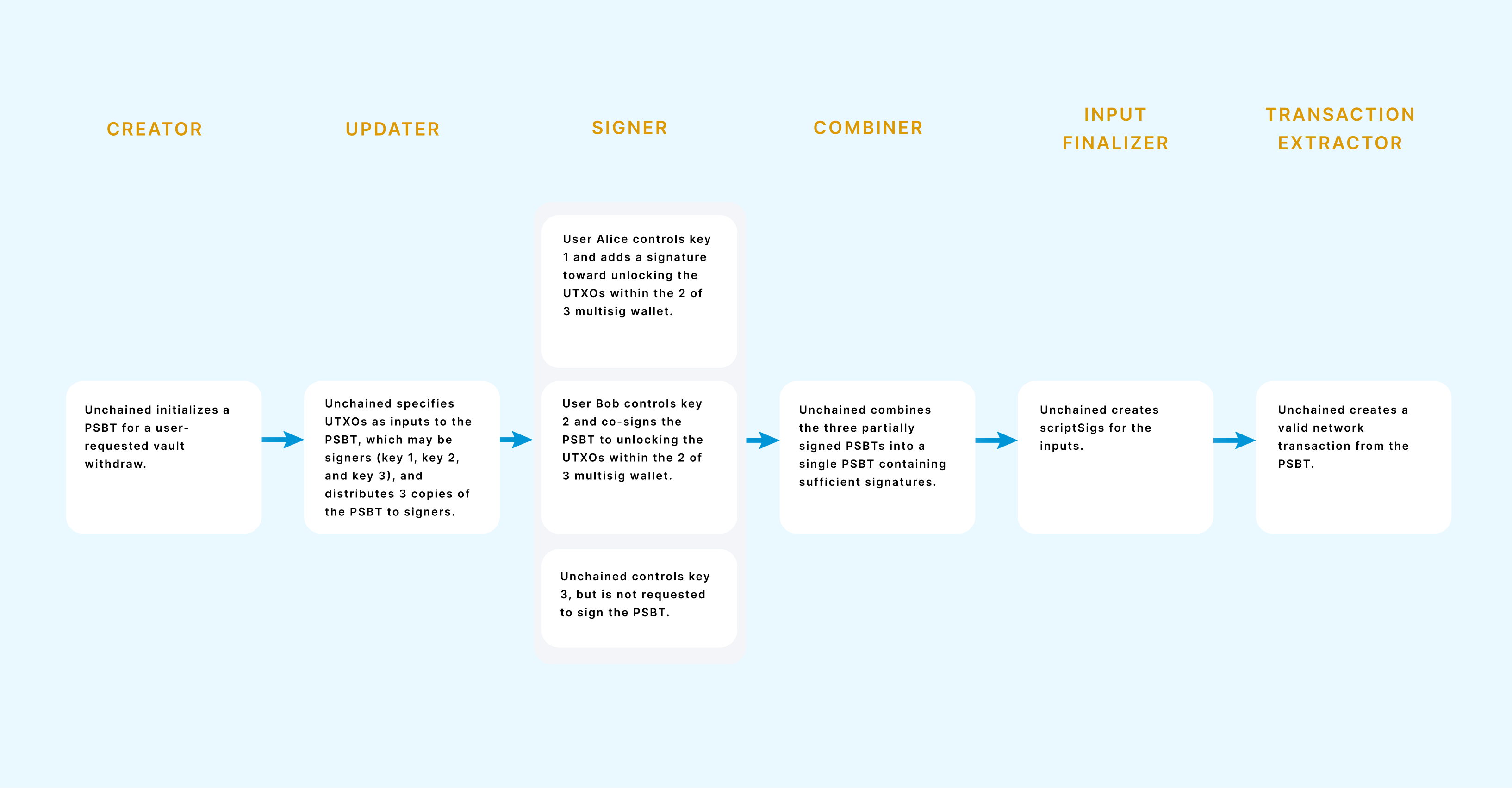 Collaborative custody at Unchained uses a 2-of-3 signature scheme where at least two keys must sign the transaction. Unchained provides a PSBT to the Signers where the inputs and outputs of the transaction have been defined to match the user’s request. It is up to the Signers to provide signatures for the UTXOs being used as the inputs for the PSBT. This constructed PSBT is distributed simultaneously to all Signers. It does not matter which order the Signers add their signature, and they need not have the state of the other 2 PSBTs to perform their signing. After adding their signature, each of the PSBTs containing one signature are returned to Unchained which picks up the PSBT saga at the Combiner role. These separately signed PSBTs are combined into a single PSBT which provides the needed quorum of signatures. The signed bitcoin transaction can then be created when Unchained fulfills the Extractor role.