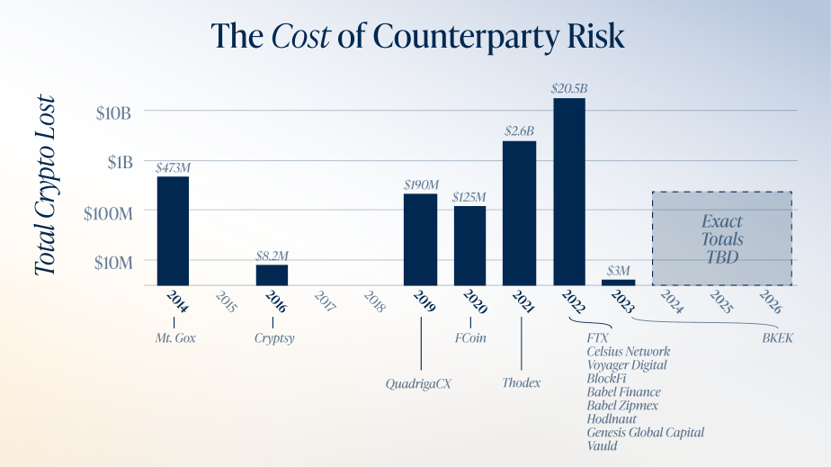 Bitcoin was launched in 2009, shortly after the global financial crisis. This historical backdrop fueled critiques of the existing financial system and the trust required to make it work, which can be found in the bitcoin whitepaper itself. Bitcoin introduced a new, alternative system that minimizes trust and uncertainty. However, since then we’ve witnessed a pattern of people choosing to reintroduce trust by letting a custodian hold their bitcoin, eventually ending in fractional reserves and catastrophe. Examples include Mt. Gox in 2014, then QuadrigaCX in 2019, then FTX, BlockFi and Celsius in 2022. Bitcoin has a strict finite supply and no bailouts, so if custodians take risks or fail to protect bitcoin from loss or theft, recovery is often impossible.
