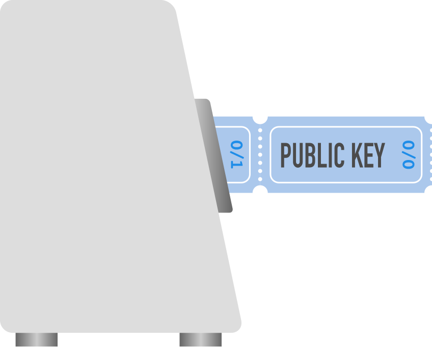 A Bitcoin wallet takes the xpub (top half of the ticket roll) and feeds it into a dispensing machine, which outputs tickets one at a time, dispensing a new one after each transaction.