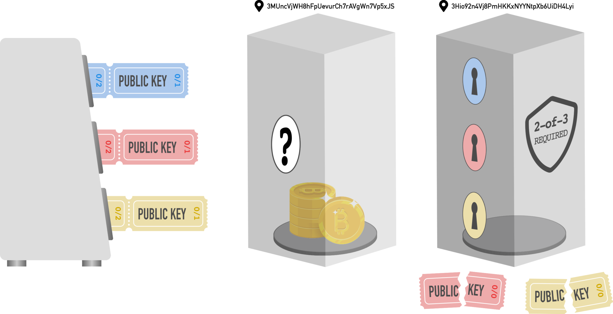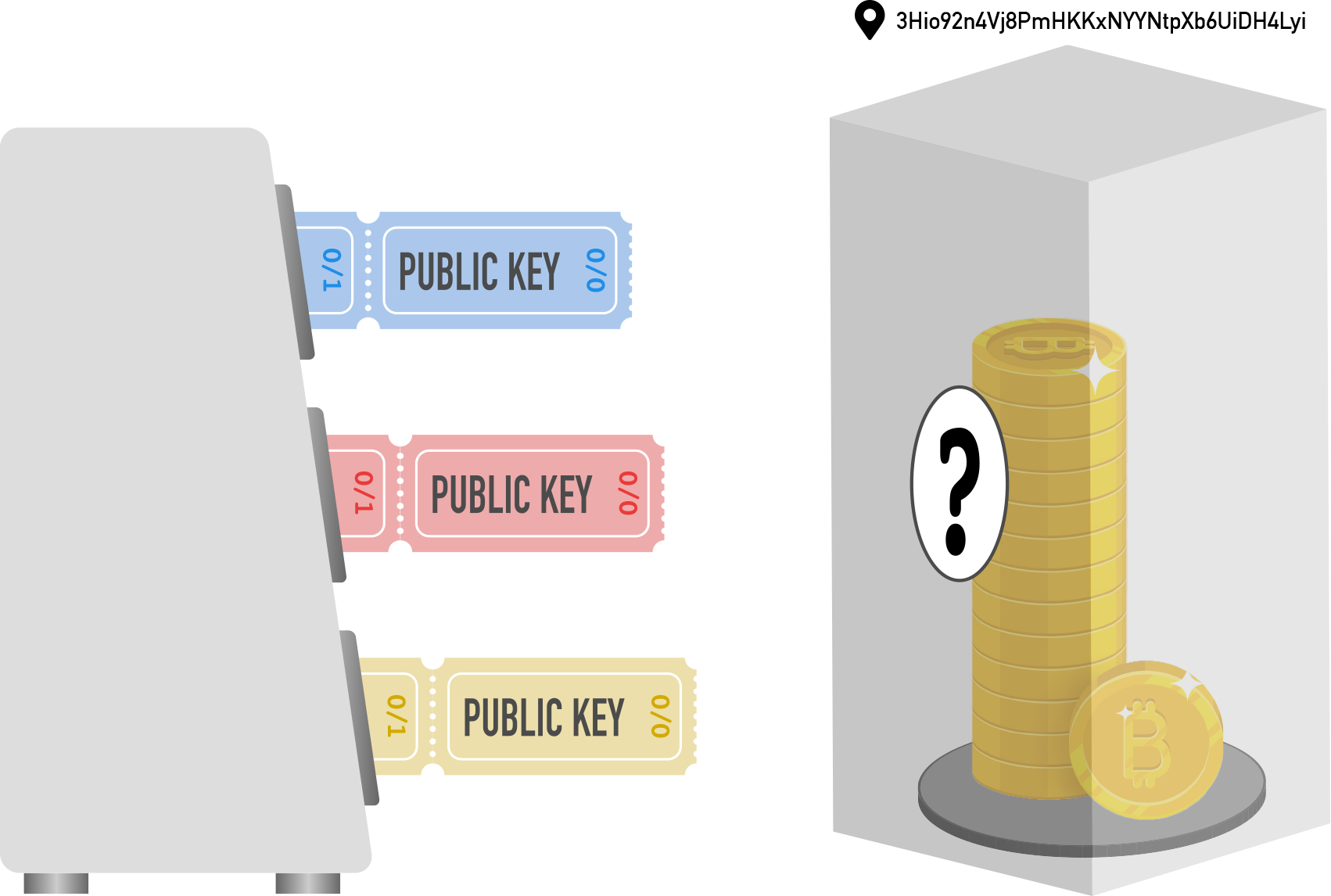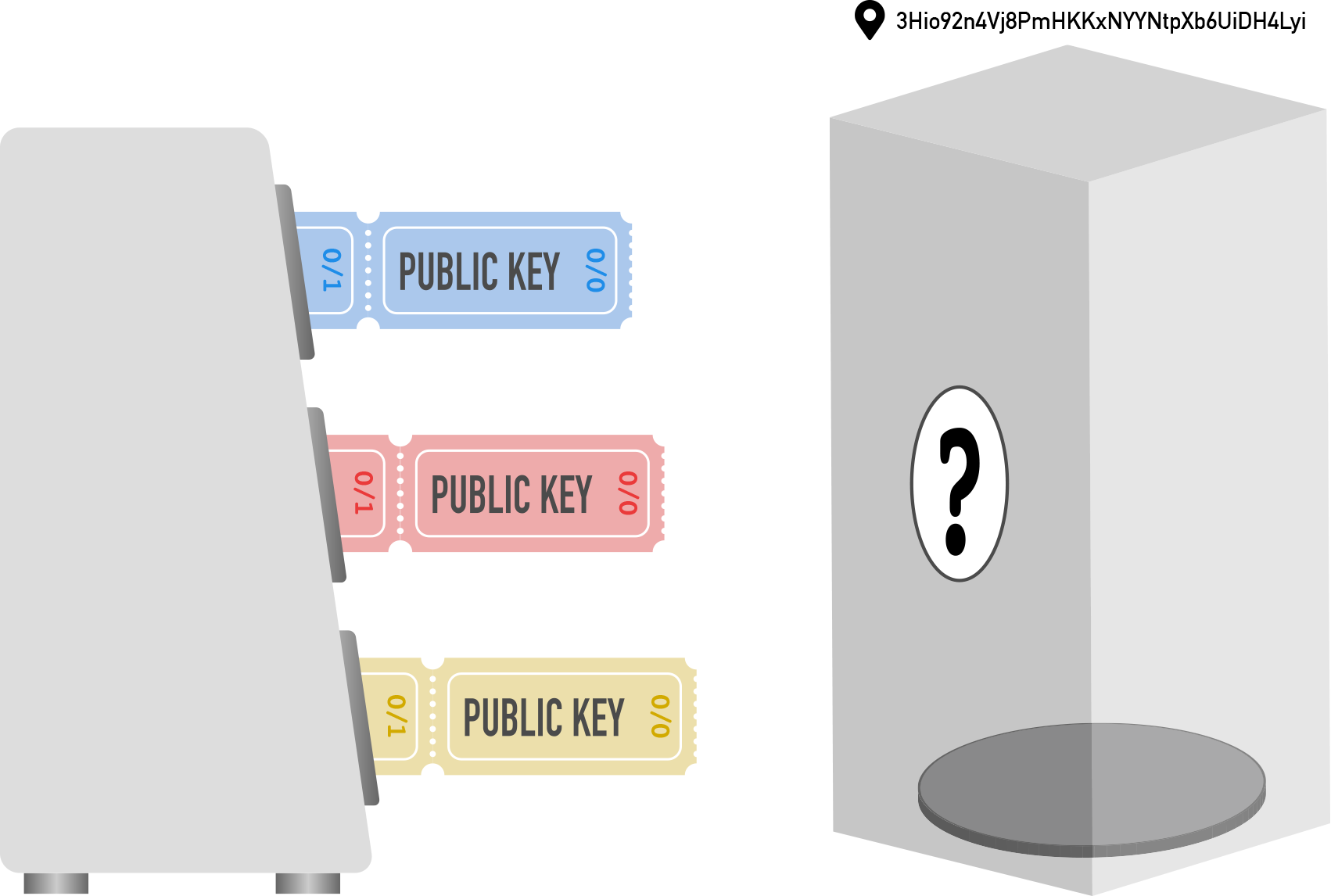 To create the first multisig address, the machine (your wallet) takes the first ticket from each roll (“0/0”) and, with some clever processing, generates a new address based on all three.