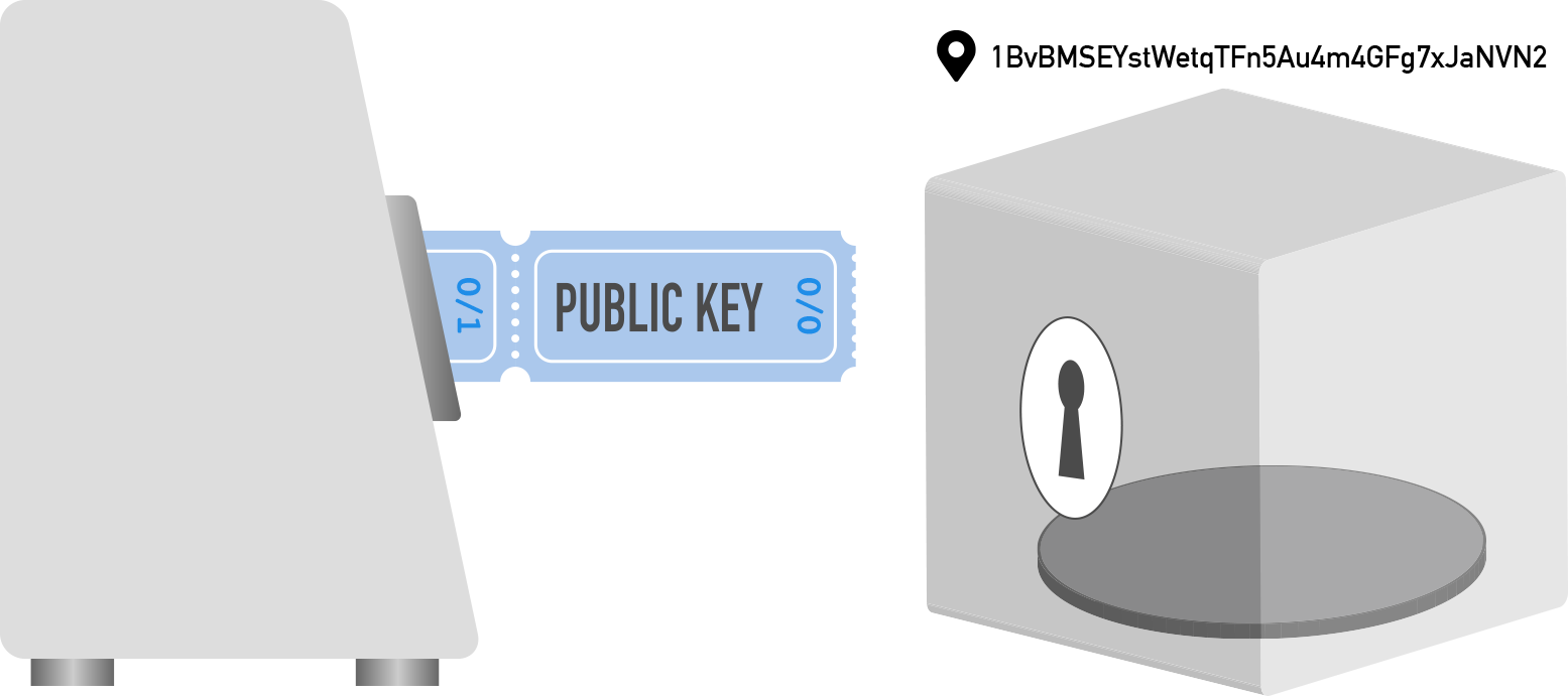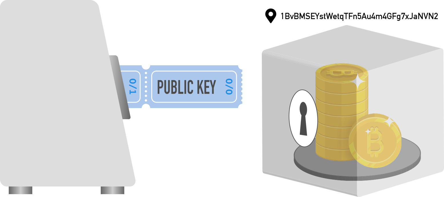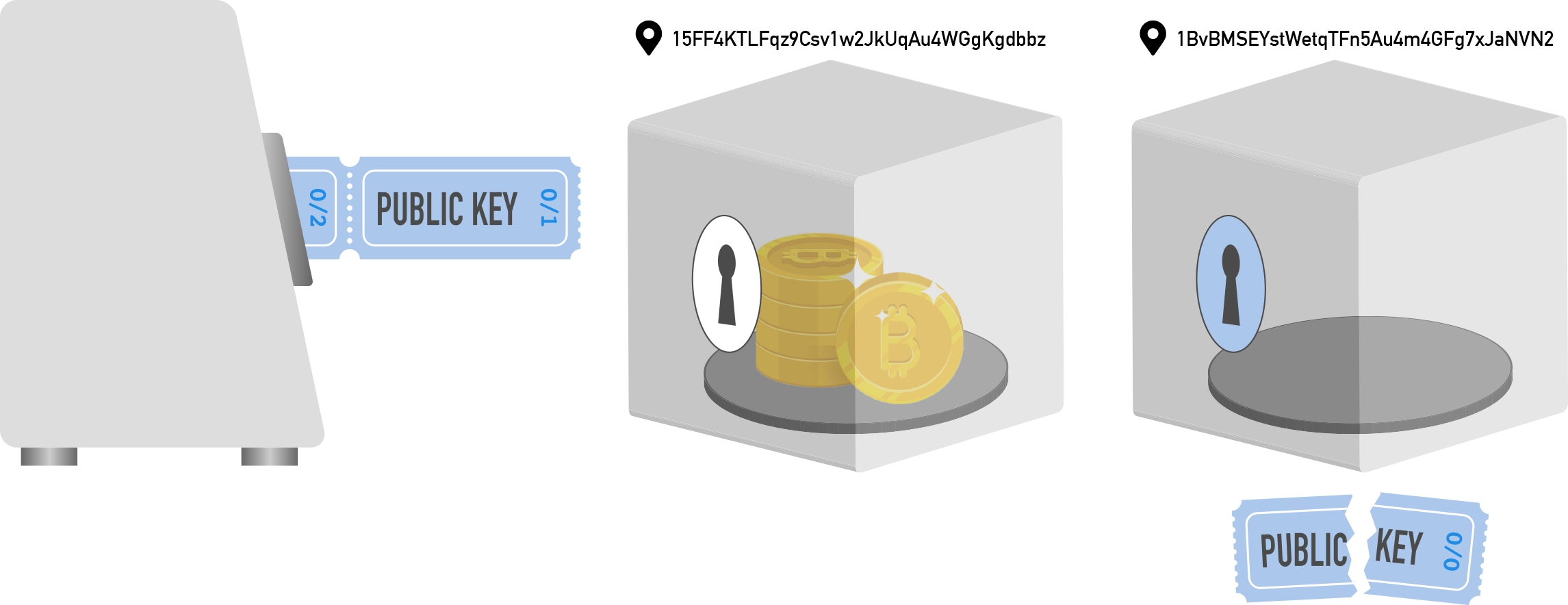 The individual tickets in the bottom row are your private keys. At a raffle, the KEEP THIS COUPON ticket is used to prove your ownership of the prize when its corresponding TICKET is drawn. With Bitcoin, you use your private key (to sign a transaction) to prove your ownership of the bitcoin at an address and complete your transaction.