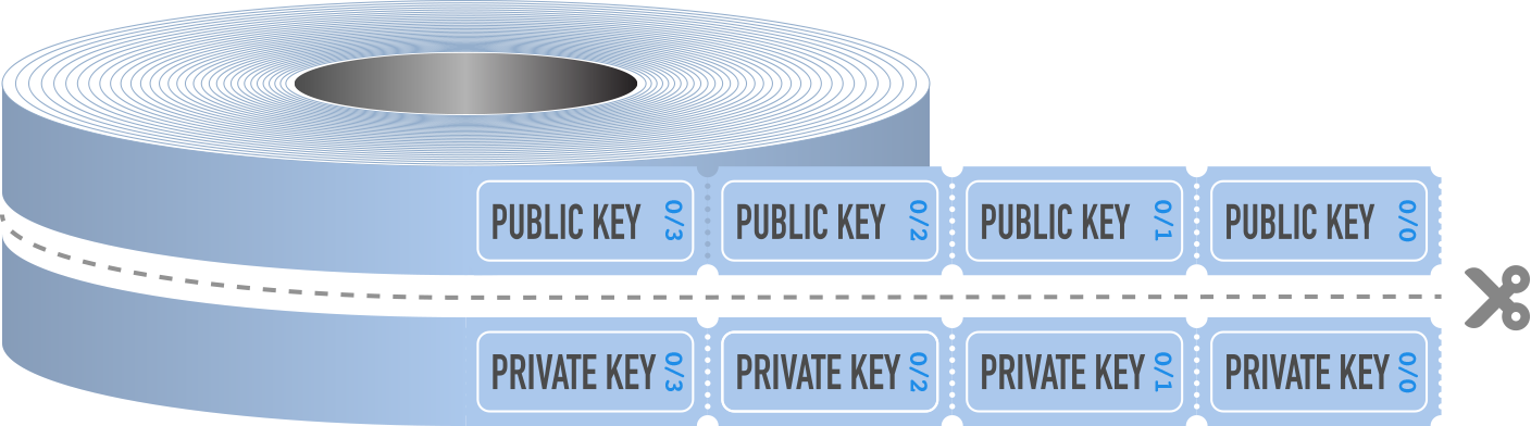 If you purchase a roll of raffle tickets, you will find that it actually begins as a double roll.When someone buys entry into the raffle, a ticket from the top row (TICKET) is kept by the organiser and the corresponding ticket from the bottom row (KEEP THIS COUPON) is kept by the buyer. The specifics of the prize draw process are not important for this analogy, but the important thing to note is that when a ticket is drawn, the owner proves their ownership of the ticket by presenting the matching ticket from the pair.