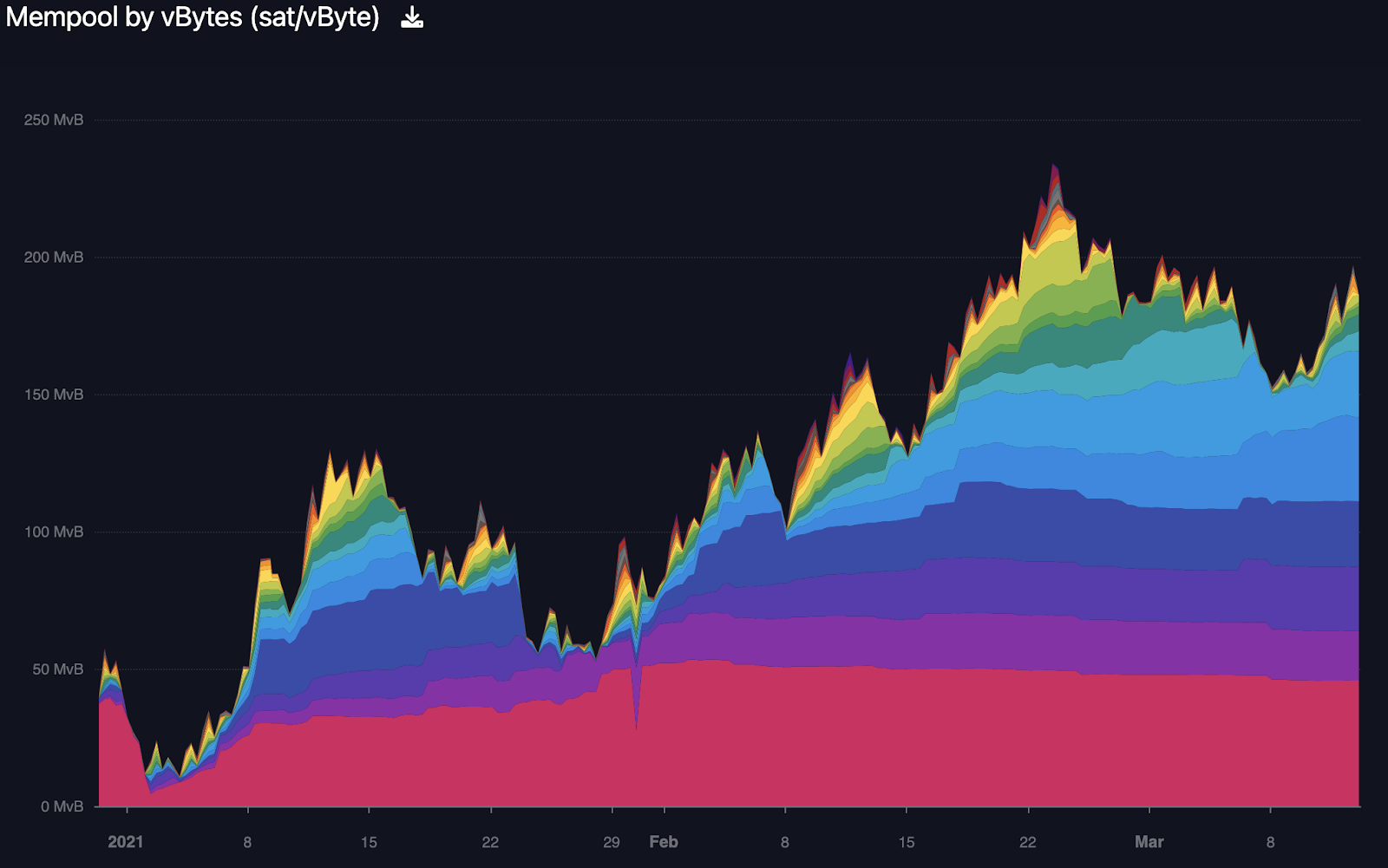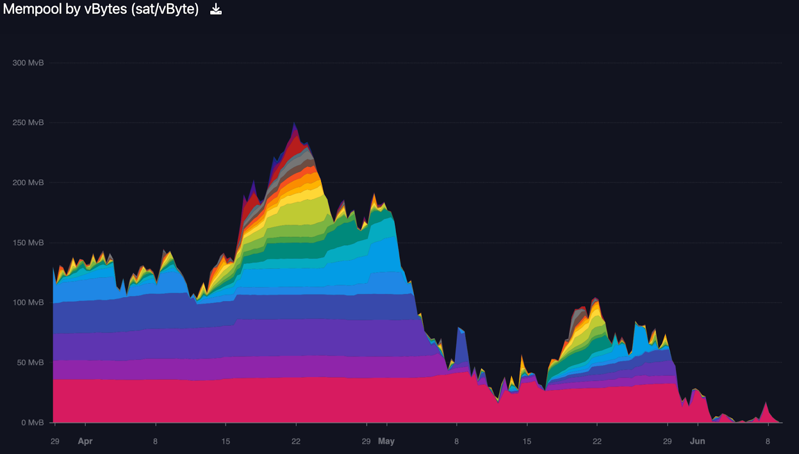 During this heated fee environment in early 2021, the mempool didn’t completely clear until June, when the price of bitcoin fell and excitement died down.