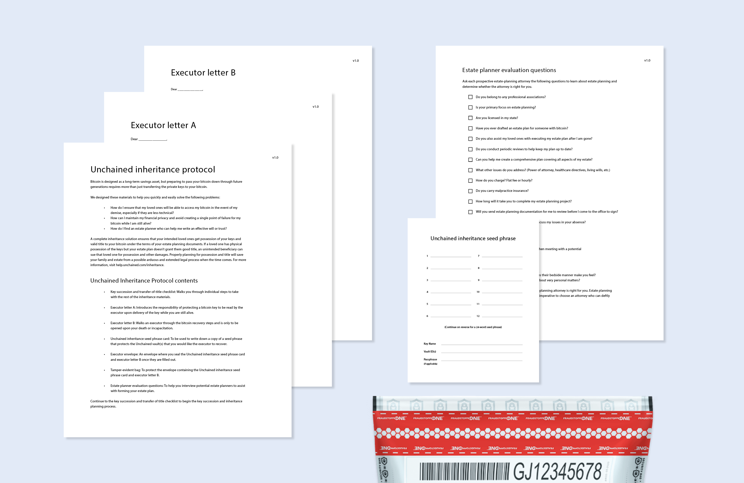 The Unchained Inheritance Protocol is a complete package of documents providing everything you need to prepare your Unchained vault for inheritance. The protocol has been carefully designed to preserve your privacy and to avoid creating single points of failure. It includes: