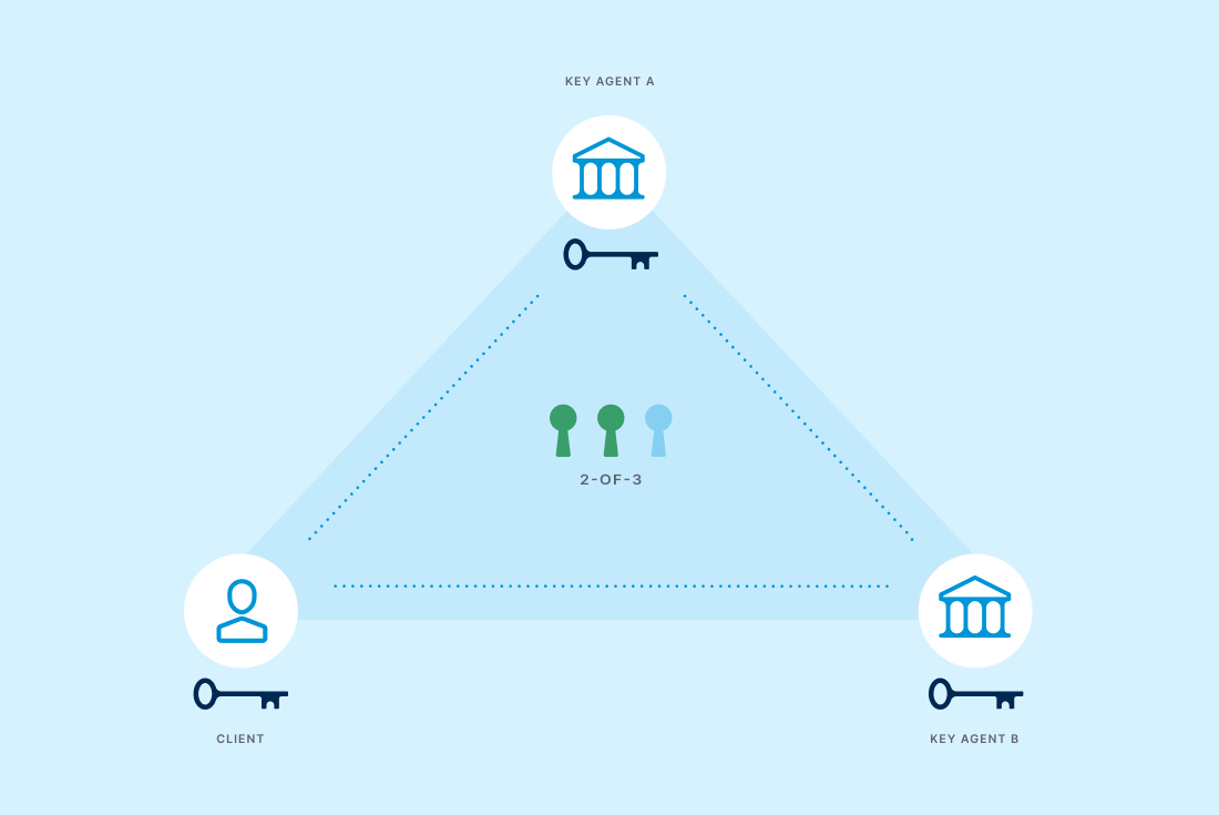 In this model of multi-institution custody, a client can hire multiple key agents from the network to secure keys on their behalf. A client is required to place the most trust in third-party key agents with this model because they do not control enough keys to move their bitcoin. You, as a client of this model, have to trust that: